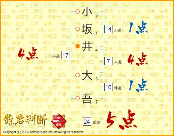 小(3画)坂(7画)井(4画) 大(3画)吾(7画)