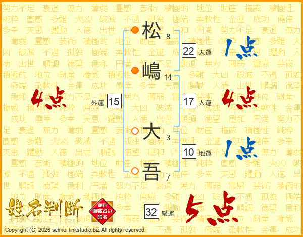 松(8画)嶋(14画) 大(3画)吾(7画)