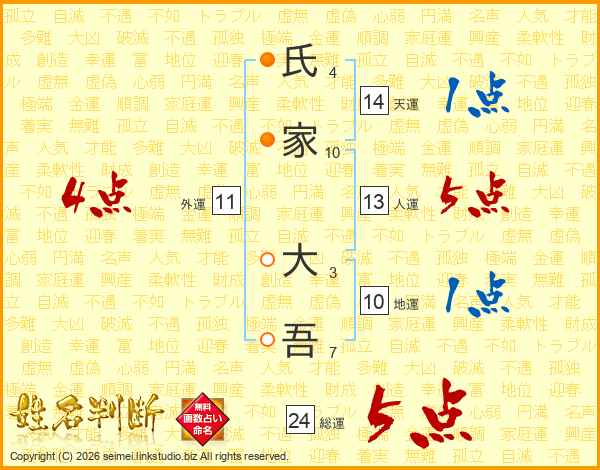 氏(4画)家(10画) 大(3画)吾(7画)