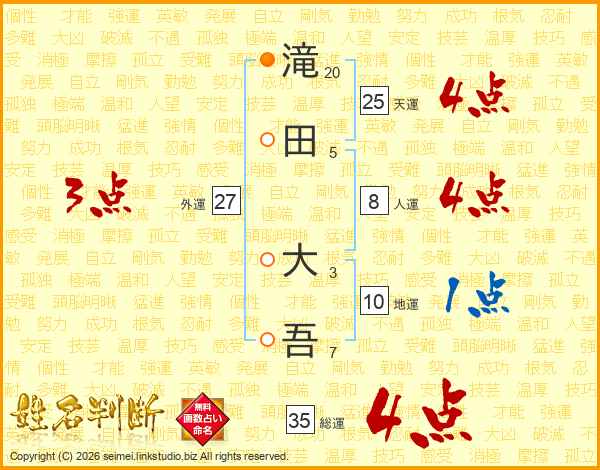 生活面を象徴する運勢です。外部から受ける影響力を表し、結婚運、家庭運や職場、環境への順応性を表します。総運から人運を引いた画数。姓や名が1文字の場合を除く。