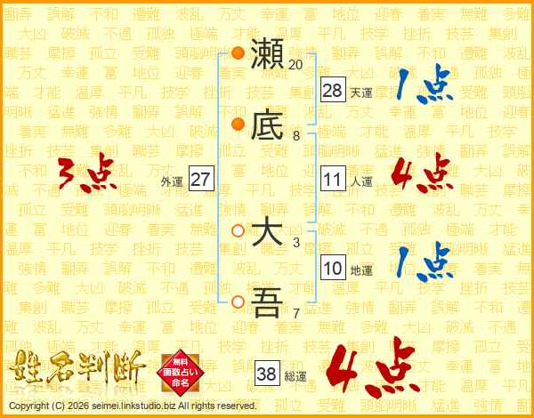 瀬(20画)底(8画) 大(3画)吾(7画)