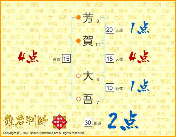 芳(8画)賀(12画) 大(3画)吾(7画)