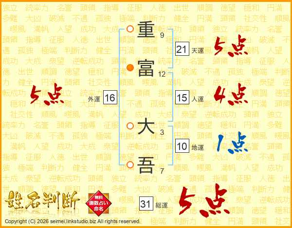 重(9画)富(12画) 大(3画)吾(7画)