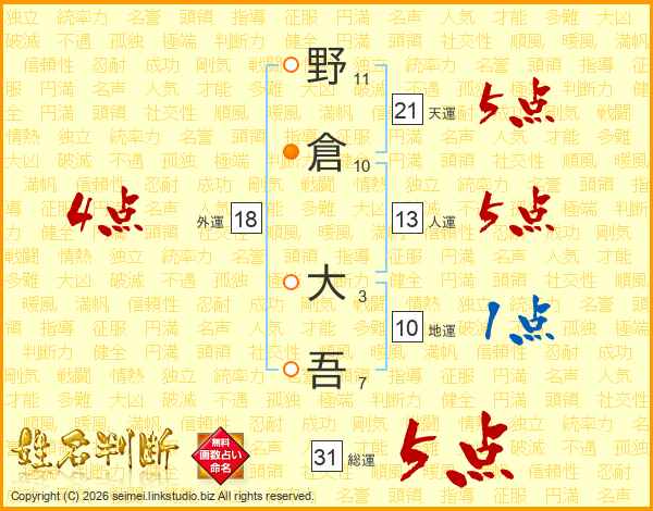 あなたの人生を表す1番重要な運勢です。生涯を通じて影響する総合運となり、主に50歳以降の晩年期に影響を及ぼします。苗字と名前の合計画数。