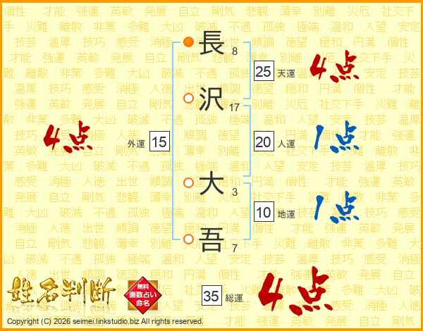 生活面を象徴する運勢です。外部から受ける影響力を表し、結婚運、家庭運や職場、環境への順応性を表します。総運から人運を引いた画数。姓や名が1文字の場合を除く。