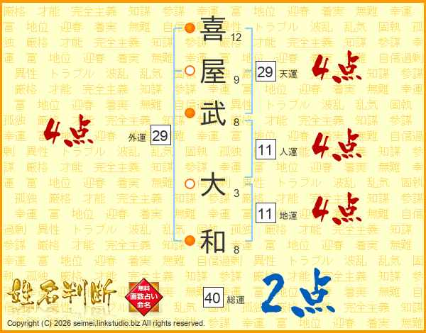 喜(12画)屋(9画)武(8画) 大(3画)和(8画)