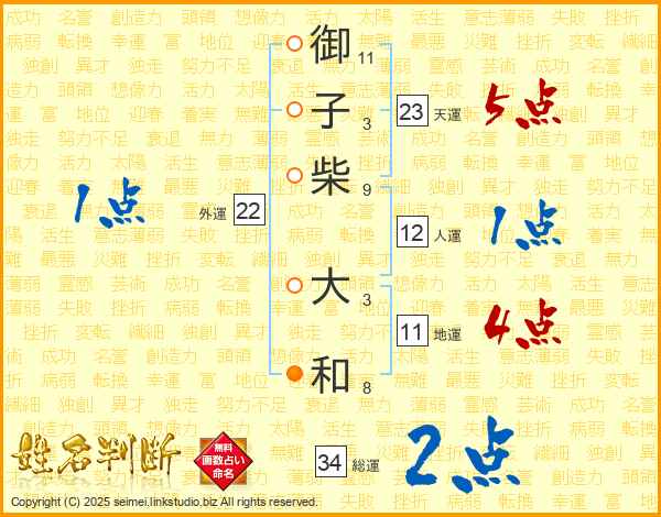 御(11画)子(3画)柴(9画) 大(3画)和(8画)