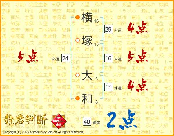 生活面を象徴する運勢です。外部から受ける影響力を表し、結婚運、家庭運や職場、環境への順応性を表します。総運から人運を引いた画数。姓や名が1文字の場合を除く。