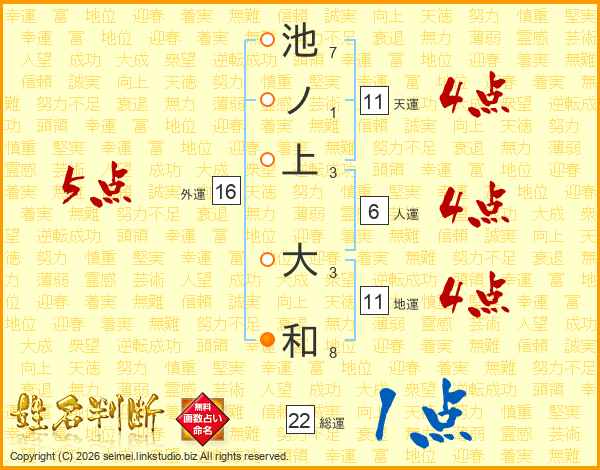 池ノ上大和さんの総運は22画の1点!