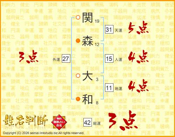関(19画)森(12画) 大(3画)和(8画)