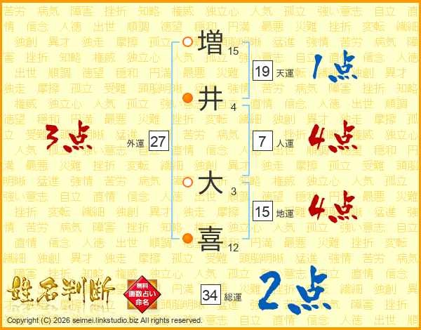増(15画)井(4画) 大(3画)喜(12画)
