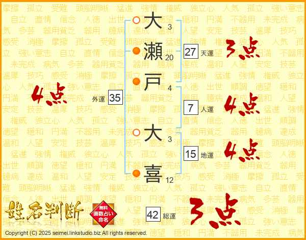大(3画)瀬(20画)戸(4画) 大(3画)喜(12画)