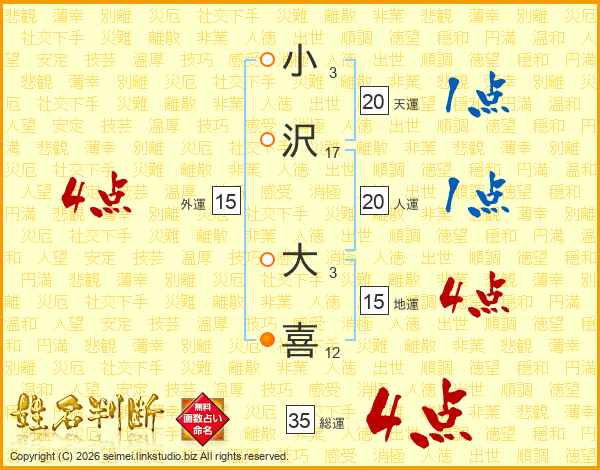 小(3画)沢(17画) 大(3画)喜(12画)