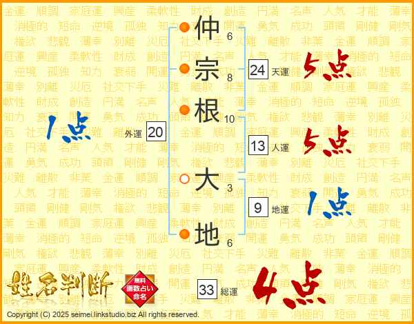 仲(6画)宗(8画)根(10画) 大(3画)地(6画)