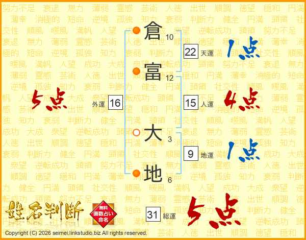 倉富大地さんの総運は31画の5点!