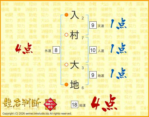 生活面を象徴する運勢です。外部から受ける影響力を表し、結婚運、家庭運や職場、環境への順応性を表します。総運から人運を引いた画数。姓や名が1文字の場合を除く。