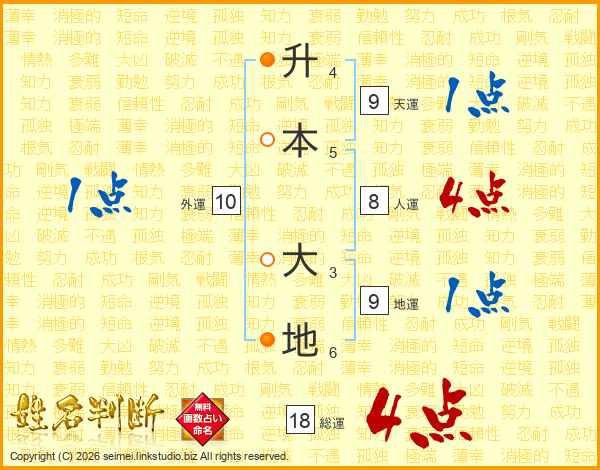 生活面を象徴する運勢です。外部から受ける影響力を表し、結婚運、家庭運や職場、環境への順応性を表します。総運から人運を引いた画数。姓や名が1文字の場合を除く。