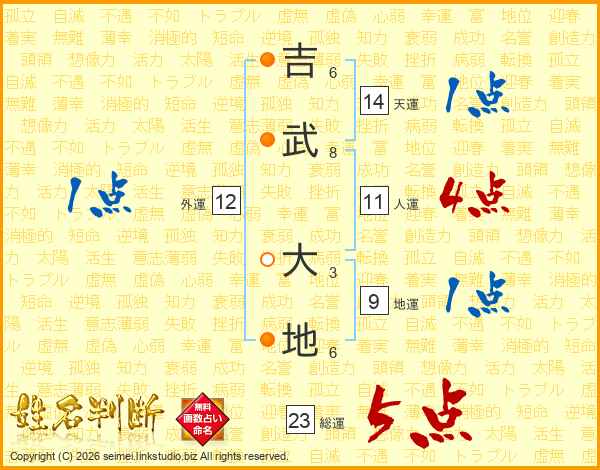 生活面を象徴する運勢です。外部から受ける影響力を表し、結婚運、家庭運や職場、環境への順応性を表します。総運から人運を引いた画数。姓や名が1文字の場合を除く。