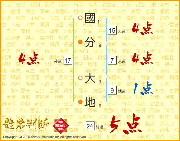 生活面を象徴する運勢です。外部から受ける影響力を表し、結婚運、家庭運や職場、環境への順応性を表します。総運から人運を引いた画数。姓や名が1文字の場合を除く。