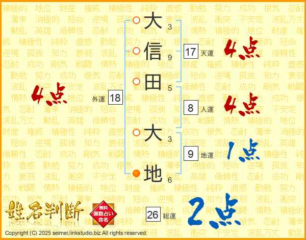 大(3画)信(9画)田(5画) 大(3画)地(6画)