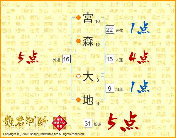 宮森大地さんの総運は31画の5点!