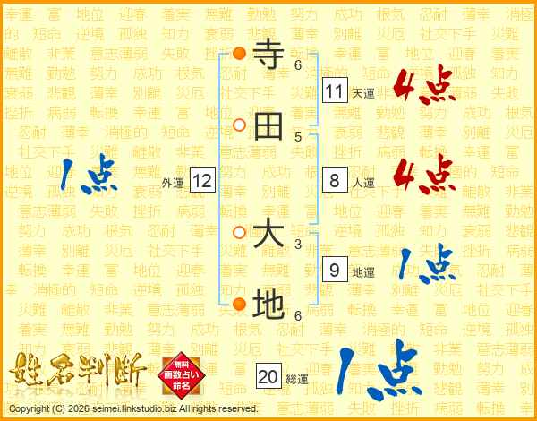 生活面を象徴する運勢です。外部から受ける影響力を表し、結婚運、家庭運や職場、環境への順応性を表します。総運から人運を引いた画数。姓や名が1文字の場合を除く。