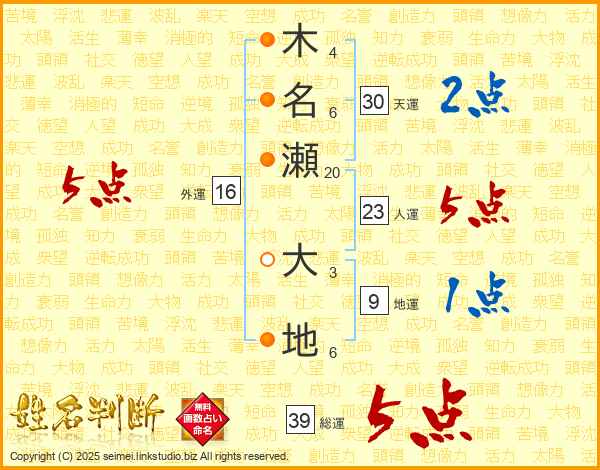 木(4画)名(6画)瀬(20画) 大(3画)地(6画)