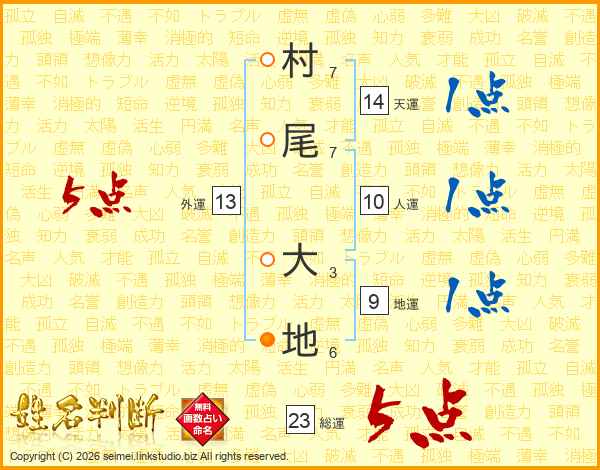 生活面を象徴する運勢です。外部から受ける影響力を表し、結婚運、家庭運や職場、環境への順応性を表します。総運から人運を引いた画数。姓や名が1文字の場合を除く。