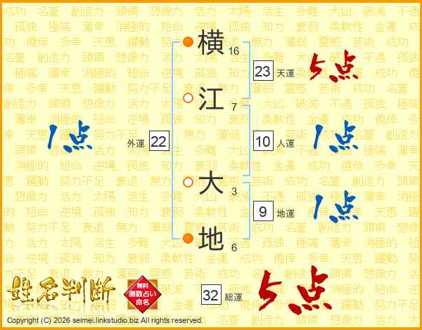 生活面を象徴する運勢です。外部から受ける影響力を表し、結婚運、家庭運や職場、環境への順応性を表します。総運から人運を引いた画数。姓や名が1文字の場合を除く。