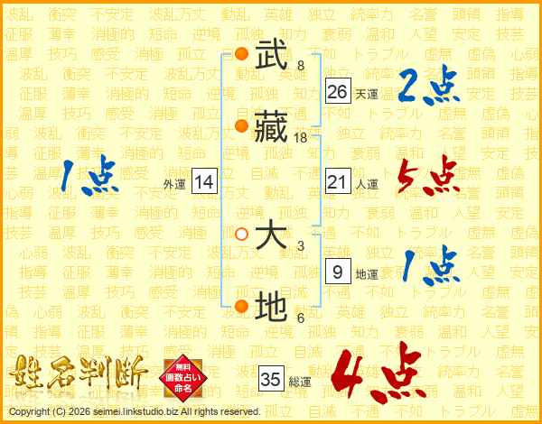 生活面を象徴する運勢です。外部から受ける影響力を表し、結婚運、家庭運や職場、環境への順応性を表します。総運から人運を引いた画数。姓や名が1文字の場合を除く。