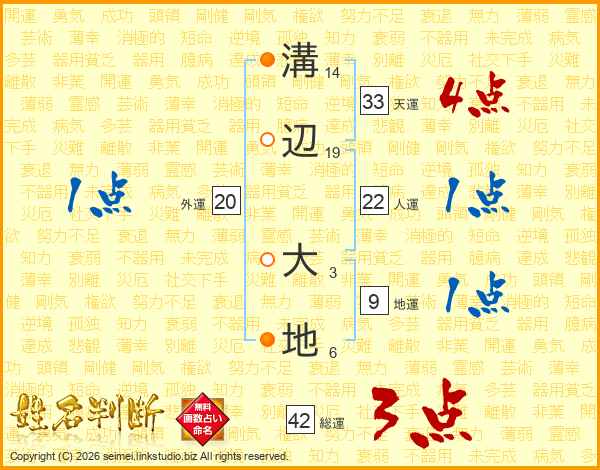 生活面を象徴する運勢です。外部から受ける影響力を表し、結婚運、家庭運や職場、環境への順応性を表します。総運から人運を引いた画数。姓や名が1文字の場合を除く。