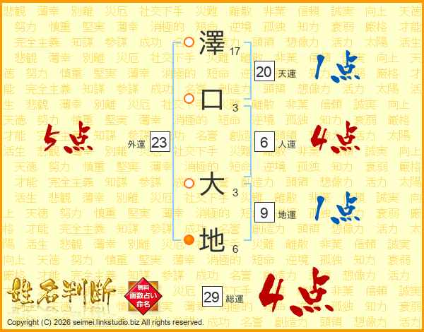 澤(17画)口(3画) 大(3画)地(6画)