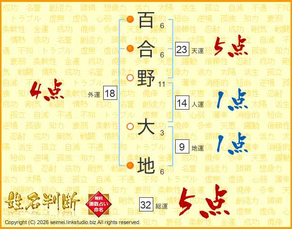 百合野大地さんの総運は32画の5点!