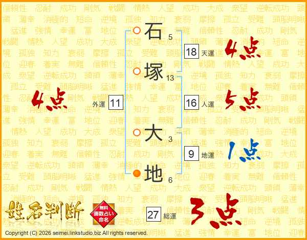 あなたの人生を表す1番重要な運勢です。生涯を通じて影響する総合運となり、主に50歳以降の晩年期に影響を及ぼします。苗字と名前の合計画数。