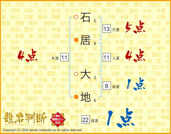 生活面を象徴する運勢です。外部から受ける影響力を表し、結婚運、家庭運や職場、環境への順応性を表します。総運から人運を引いた画数。姓や名が1文字の場合を除く。