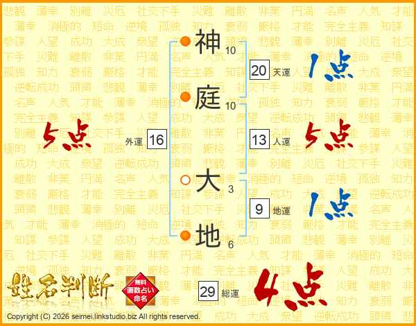 生活面を象徴する運勢です。外部から受ける影響力を表し、結婚運、家庭運や職場、環境への順応性を表します。総運から人運を引いた画数。姓や名が1文字の場合を除く。
