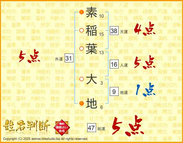 素(10画)稲(15画)葉(13画) 大(3画)地(6画)