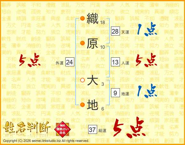 織原大地さんの総運は37画の5点!