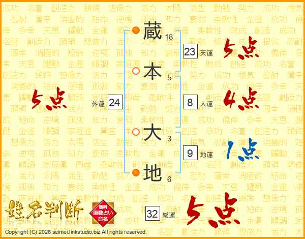 蔵本大地さんの総運は32画の5点!