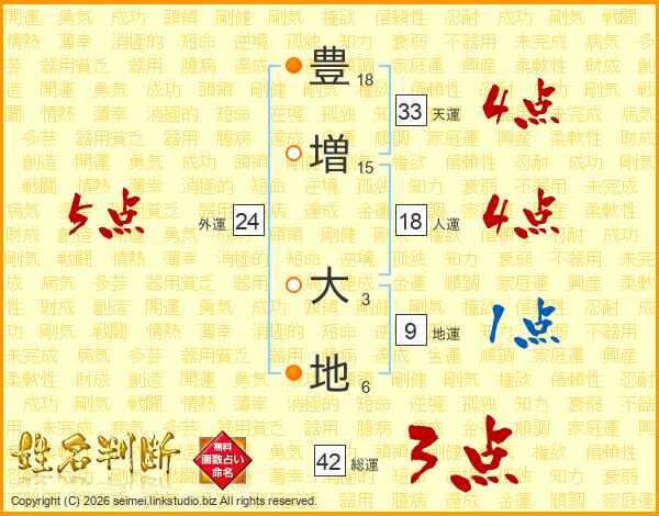 生活面を象徴する運勢です。外部から受ける影響力を表し、結婚運、家庭運や職場、環境への順応性を表します。総運から人運を引いた画数。姓や名が1文字の場合を除く。