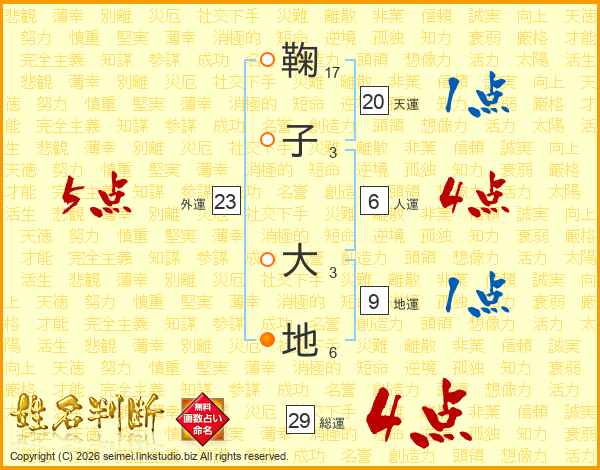 生活面を象徴する運勢です。外部から受ける影響力を表し、結婚運、家庭運や職場、環境への順応性を表します。総運から人運を引いた画数。姓や名が1文字の場合を除く。