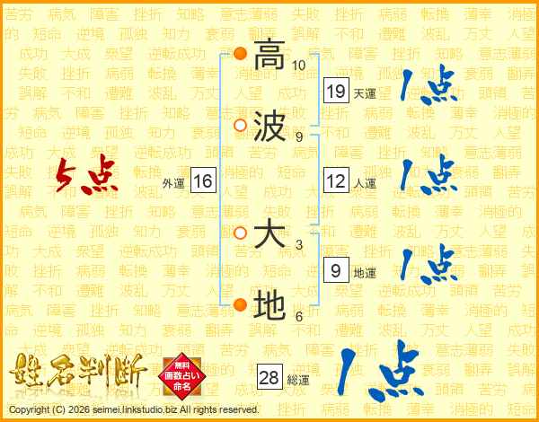 生活面を象徴する運勢です。外部から受ける影響力を表し、結婚運、家庭運や職場、環境への順応性を表します。総運から人運を引いた画数。姓や名が1文字の場合を除く。