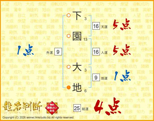 生活面を象徴する運勢です。外部から受ける影響力を表し、結婚運、家庭運や職場、環境への順応性を表します。総運から人運を引いた画数。姓や名が1文字の場合を除く。