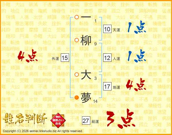 一柳大夢さんの総運は27画の3点!