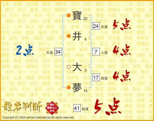 寶井大夢さんの総運は41画の5点!