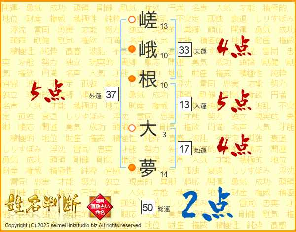 嵯(13画)峨(10画)根(10画) 大(3画)夢(14画)