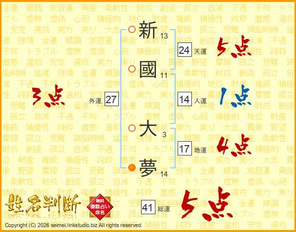 新國大夢さんの総運は41画の5点!