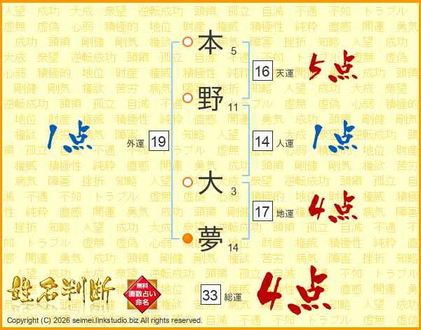 本野大夢さんの総運は33画の4点!