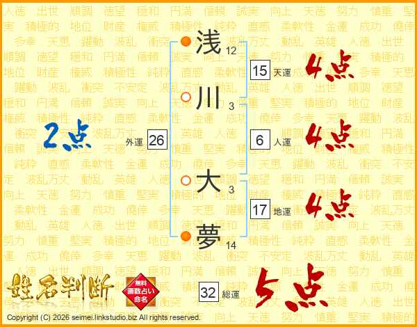 浅川大夢さんの総運は32画の5点!
