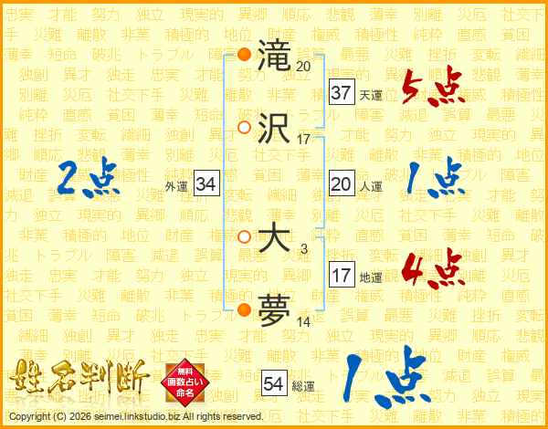 滝(20画)沢(17画) 大(3画)夢(14画)